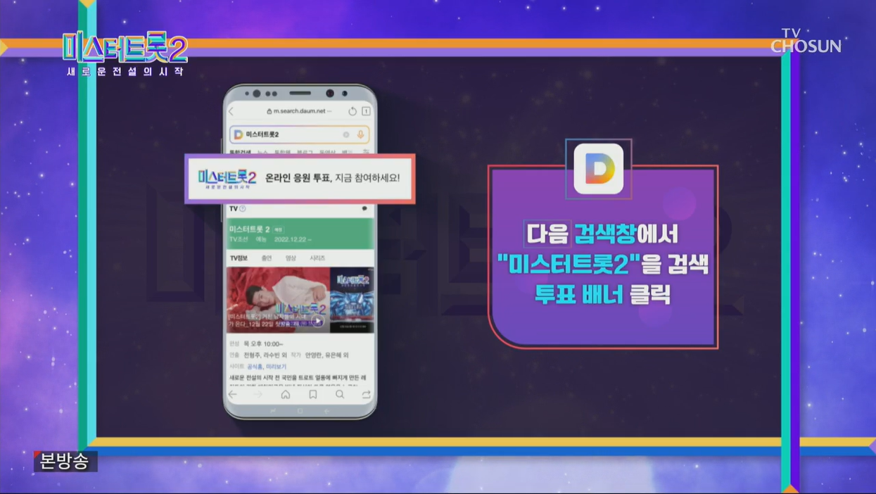 카카오톡이 아닌 인터넷으로 하시려면 다음검색창에 '미스터 트롯2'을 검색하시고 투표배너를 눌러서 진행해 주세요.