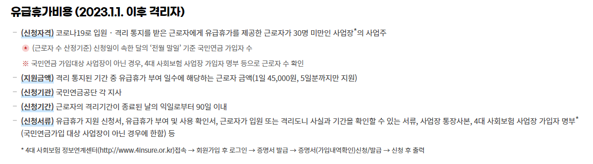 신청자격은 코로나19로 입원, 격리 통지를 받은 근로자에게 유급 휴가를 제공한 근로자가 30미만인 사업장의 사업주이어야 하고 근로자 수 산정기준은 신청일이 속한 달의 '전월 말일' 기준 국민연금 가입자수를 기준으로 합니다.