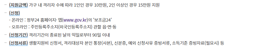 지원금액 가구 내 격리자 수에 따라 1인인 경우 10만원, 2인 이상의 경우 15만원 지원이 됩니다.